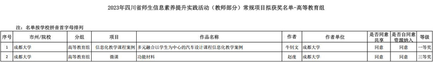 教师牛钊文的信息化教学课程案例作品《多元融合以学生为中心的汽车设计课程信息化教学案例》在高等教育组中荣获一等奖,赵虔老师的微课作品《功能材料》在高等教育组中荣获三等奖。
