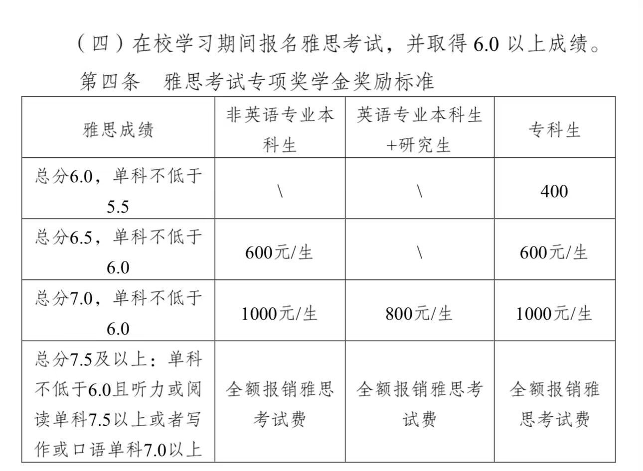 (七)同一学年内,获得雅思考试专项奖学金的学生可以同时申请并获得国家奖学金、国家励志奖学金、国家助学金和学校奖学金,但不能同时获得学校其他类别单项奖学金。