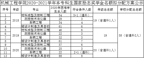 2.国家励志奖学金分配名额56人,拟推荐58人,差额2人,要求申请人在2020-2021学年被认定为家庭经济困难学生,且学习成绩要求按照综合素质测评及学年成绩进行评选。具体名额分配如下。