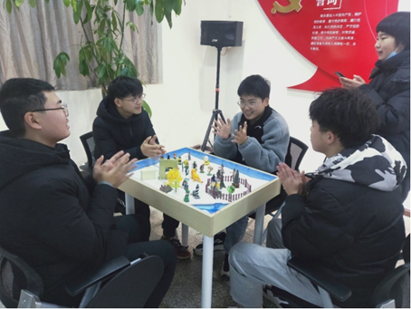 围绕着沙盘,部长带领大家进行了一个自我介绍的小游戏,气氛变得轻松而愉快,在一片和谐的氛围中,同学们全身心地投入到沙盘游戏之中。
