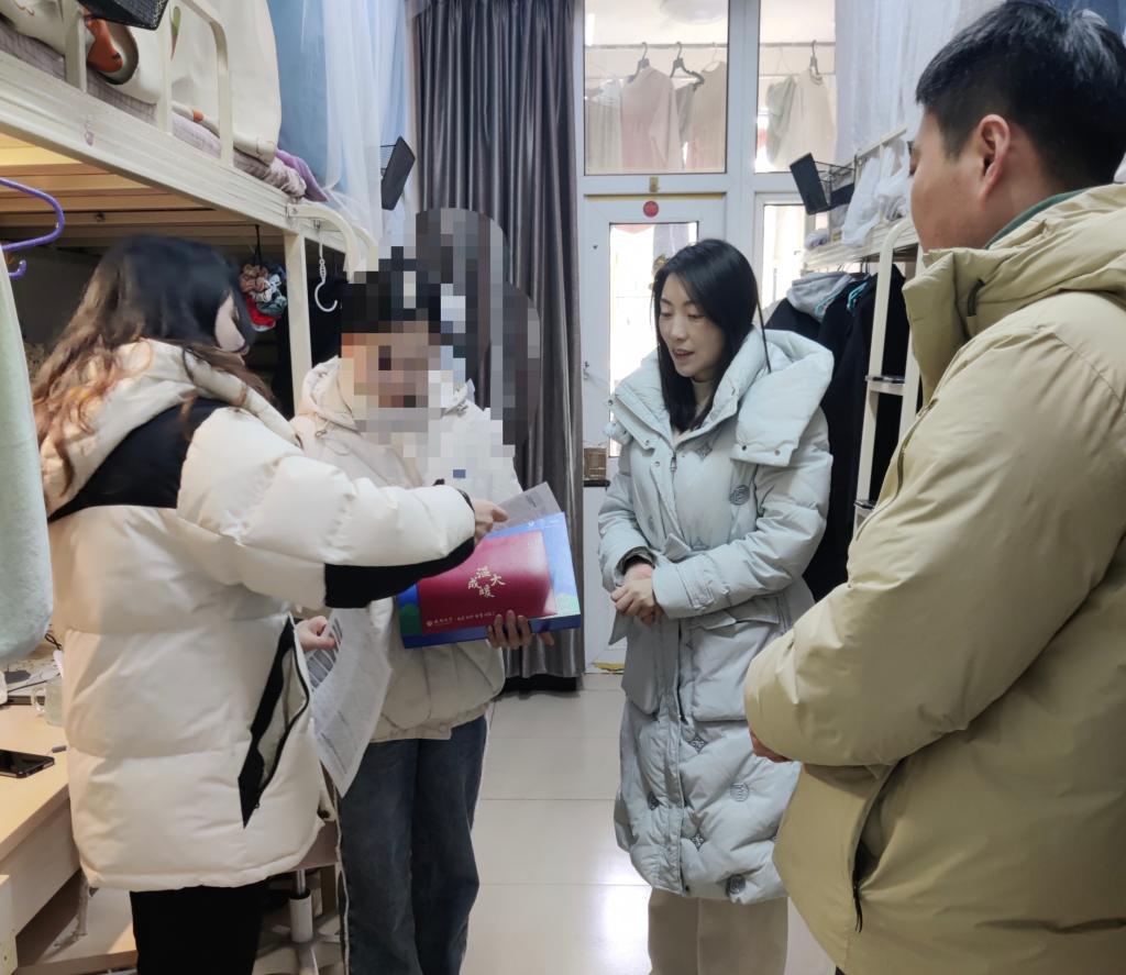 走访期间,陈倩龄与同学们亲切交流,了解同学们本学期学习心得和期末考试情况,鼓励同学们克服暂时的困难,保持乐观心态,好好复习,考出理想成绩。同时询问同学们离校安排,寒假规划等情况,并向家庭经济困难学生送去了学校的温暖和关怀。辅导员们分别就假期往返交通安全,寒假注意事项对同学们做出温馨提示。