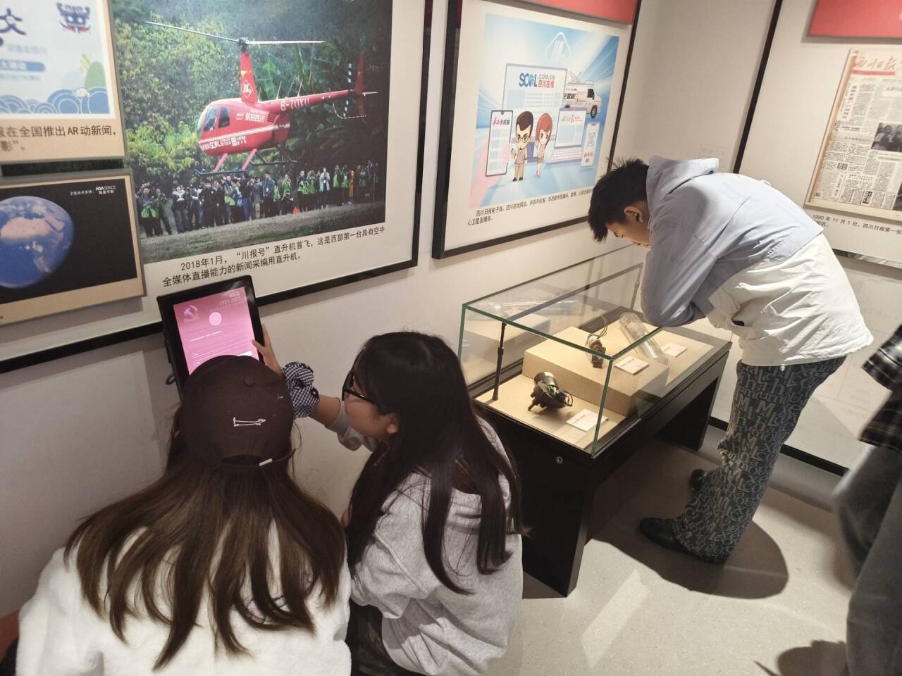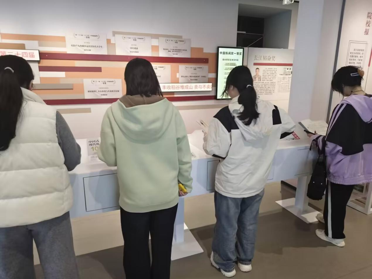 馆内参观环节,三个展厅的沉浸式体验让学子们收获颇丰。1楼临展厅的纪念中国人民抗日战争暨世界反法西斯战争胜利80周年主题漫画展,成为本次活动的“红色课堂”。2楼四川报业发展主题展中,“四报合一”“川报起步”“百花齐放”等历史资料,生动呈现了四川报业在不同时期传递政策、反映民生的重要作用,帮助同学们掌握报业发展历史关键节点。在3楼四川日报报业集团主题展,讲解员围绕集团发展历程与“围绕中心、服务大局”的核心精神展开讲解,让同学们们了解到四川报业与时代同频共振的发展脉络。