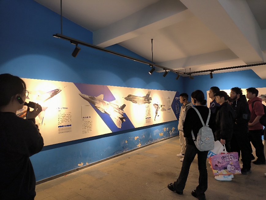 在园区解说员的引导下,师生首先步入“航空史迹”展区。地面铜板镌刻的工业脉络与展墙图文资料相互印证,清晰呈现中国航空工业从技术封锁下白手起家,到自主创新突破的发展历程。“从歼-5的仿制攻坚到歼-10的自主研制,每一步都凝结着机械工程师的心血。”解说员结合史料细节,详解不同机型的机械结构升级与国防战略意义,让学生直观感受工业制造与国家主权的紧密关联。