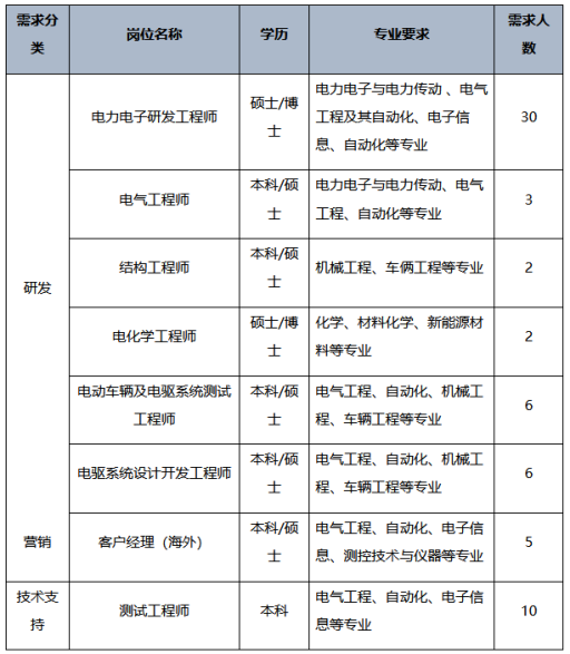 招聘专业:电力电子与电力传动、电气工程、自动化、控制理论与控制工程、车辆工程、测控技术与仪器、电子信息、机械设计、材料化学等。