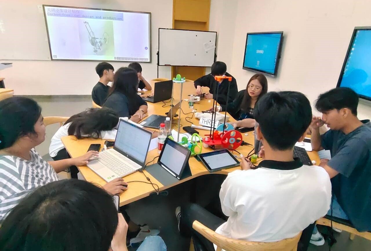 陈顺洪老师和冉龙娇老师为泰国艺术大学的交换生们带来了生动有趣的小车换向装置设计课程。在课堂上,陈老师细心讲解了换向装置的设置与设计,展示了零碳动力小车的换向系统。在志愿者的帮助下,同学们一起计算、动手协作。这次课堂不仅拓展了同学们的知识,也加深了他们对机械设计的理解。