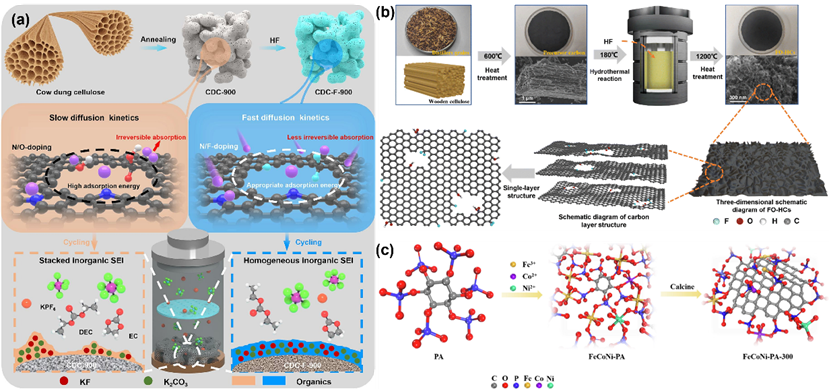 2. ab)钠/钾离子电池硬碳负极材料的合成与改性,(c)过渡金属植酸盐衍生高效析氧催化剂的合成示意图