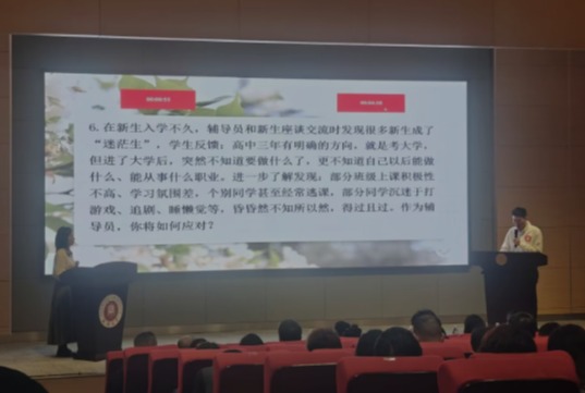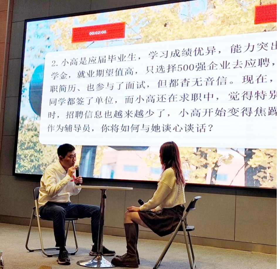 经过初赛的淘汰选拔,6位优秀辅导员来到决赛中激烈角逐。决赛过程分为谈心谈话与案例研讨两大环节,陈康老师在这两个环节中展示出深厚的理论功底、丰富的工作与实践经验。尤其是在学生职业规划与就业指导的谈心谈话环节,他精准剖析了案例背后的复杂情境,并为同学提出了切实可行、富有建设性的解决方案,获得在场评委的肯定。