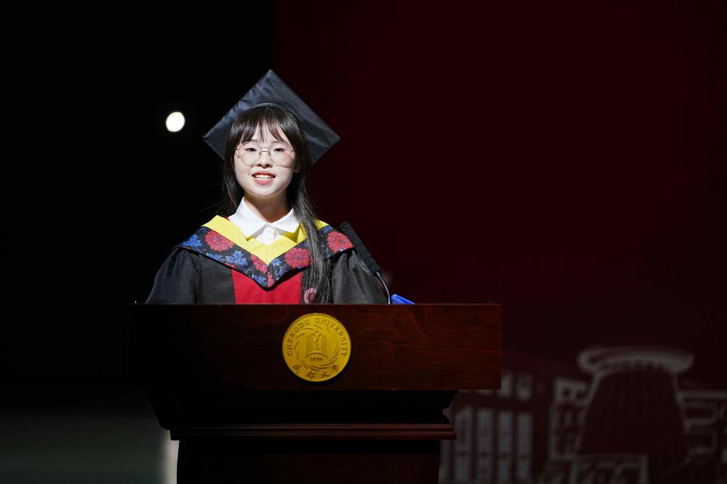2025届本科毕业生段羽洁作为毕业生代表发言。她回顾获评“十佳大学生”且位列榜首、考取川大研究生等经历,感恩师长、同窗与母校,将牢记校训前行,并为母校全体毕业生送出美好祝愿。