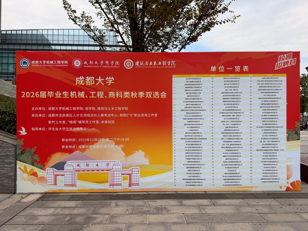 联合主办,成都市龙泉驿区人才交流培训与人事考试中心、“晓闻”辅导员工作室、商院“5·0”职业咨询工作室、箭竹工作室共同承办的2026届机械、工程、商科类毕业生秋季双选活动在学校双选厅顺利落幕。