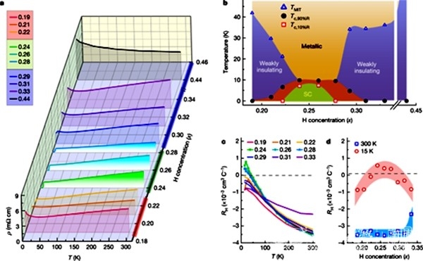 作为明星超导材料,镍酸盐外延生长薄膜仅能通过金属氢化物的拓扑反应合成。采用这种方式合成镍酸盐薄膜往往会引入氢,但由于氢元素重量较轻,大多数检测手段无法检测,从而导致人们忽略了它对薄膜结构和物理性能的影响。有鉴于此,我校高等研究院王清远教授及其博士后吴小强等,与电子科技大学乔梁教授、英国国家钻石光源周克瑾博士、北京计算科学研究中心黄兵研究员等合作,通过物性测试验证了Nd0.8Sr0.2NiO2Hx(x=0.2~0.5)薄膜的霍尔效应,揭示了氢在该薄膜中的存在形式,解开了镍酸盐超导特性的谜团。部分物性测试由我校高等研究院多功能物性测量系统(PPMS)完成,成功验证了霍尔效应。该研究得到了国家自然科学基金委、四川省科技厅、中央高校基本科研业务费等的经费支持。