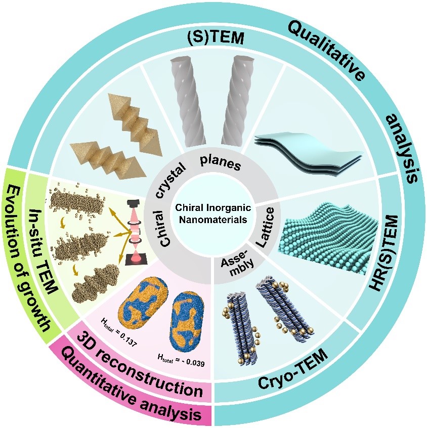 手性是自然界中一种重要的固有特性。手性无机纳米材料(CINMs)因其优异的光学、电子和催化性能而备受关注,这些特性在能源转换、数据存储、催化和生物医学等领域展现出巨大潜力。传统的光学分光技术主要揭示了这些材料在系综水平上的手性光学特性,而随着透射电子显微镜(TEM)技术的进步,科学家能够可视化CINMs的手性纳米结构。尽管该领域已经取得了显著的研究进展,但从原子到纳米尺度对这些手性结构进行全面的定性和定量分析仍有待深入理解。
