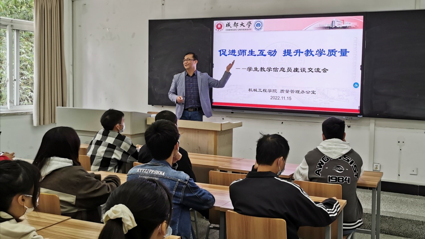 对人才培养质量提升方面的一些最新政策与精神,鼓励同学们针对相关活动及班内同学们关心的问题积极建言,主动参与到人才培养质量提升的全过程中来。之后,牛钊文老师就"成都大学学生教学信息员反馈意见表"的填写进行了详尽的讲解与分析,并就同学们提出的问题进行了现场答疑与交流。