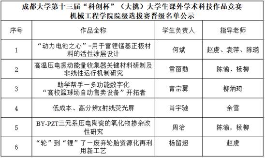 成都大学第十三届“科创杯”(大挑)大学生课外学术科技作品竞赛立博官网 院级答辩赛已于2022年4月19日下午答辩结束。经过各项目组现场答辩、评委提问后,由评委投票评审出六组队伍晋级“科创杯”校级决赛。名单公示如下: